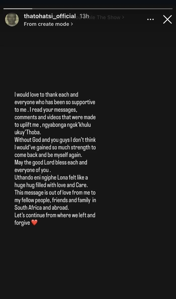 “I would like to thank each and everyone who has been so supportive to me. I read your messages, comments and videos that were made to uplift me, ngyabonga ngok’khulu ukuy’thoba (thank you very much),” she wrote. “Without God and you guys, I don’t think I would’ve gained so much strength to come back and be myself again.”