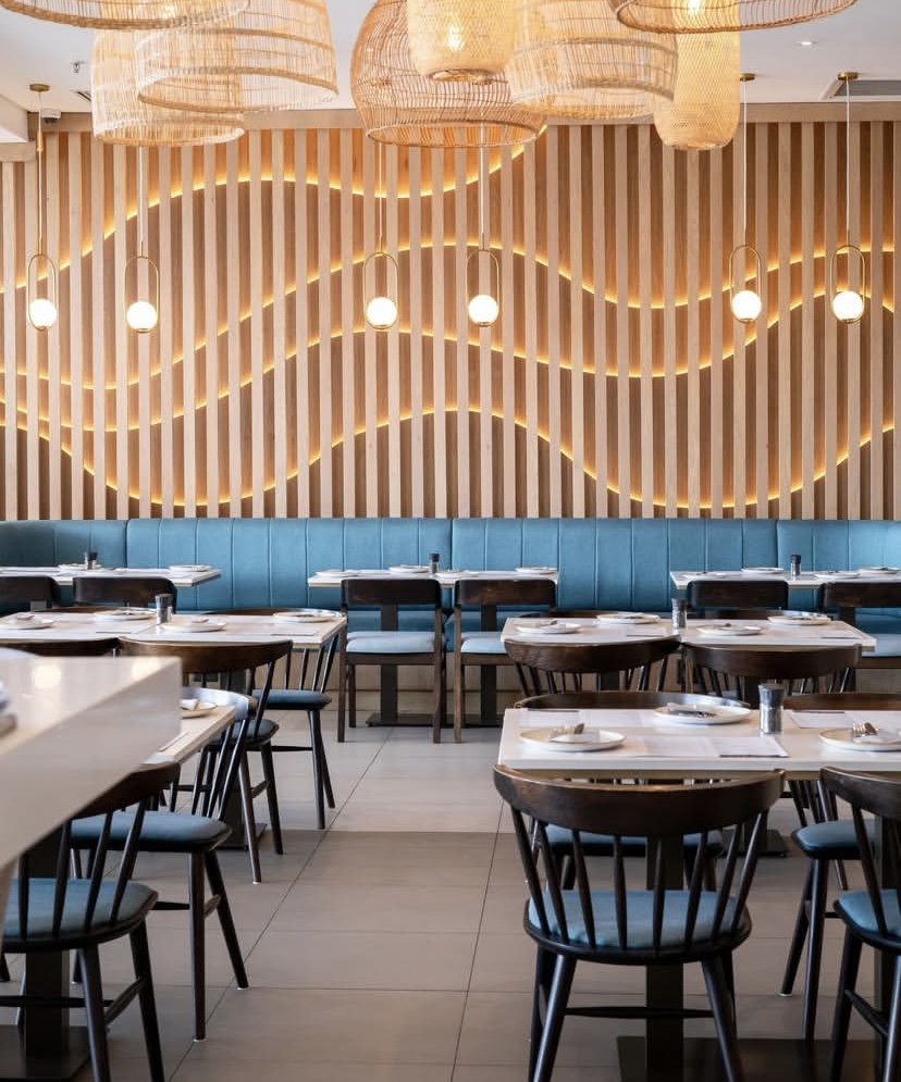 The award-winning restaurant boasts a top notch ambience with warm wood tones, natural stone finishes, and intricate designs adorning the walls, creating a trendy yet relaxed vibe.