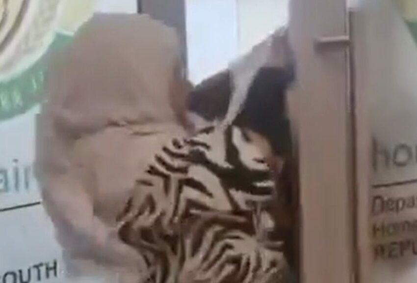 The footage, shared widely on social media, shows a tense exchange at the entrance of the Home Affairs office, where the woman is seen being forced through the doorway by security personnel.